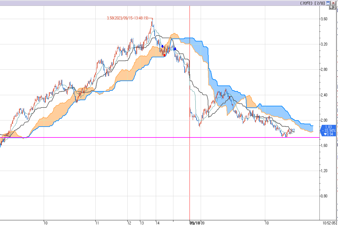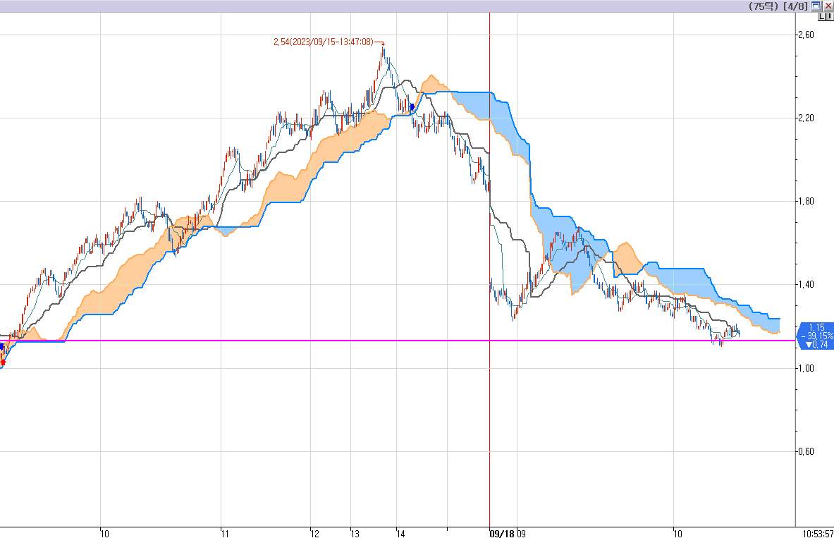 여러번 설명했다. 일목균형표 차트 설정시 기준선은 검정색, 전환선은 빨간색으로 꼭 설정해 두라고.