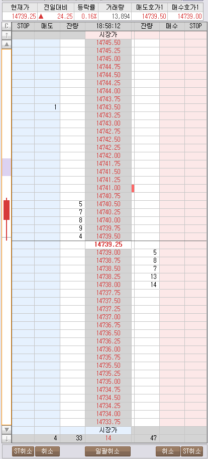 국내장 시작하고 좀 있으니까 1차 매수 목표가 14745~14750 도달 하여 4개 분할 수익 청산 되었다.