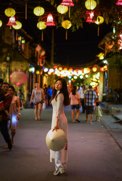 베트남 쭝투 (추석)에 길거리에 화등걸고 이쁜이가 아오야이 입은 모습이다.