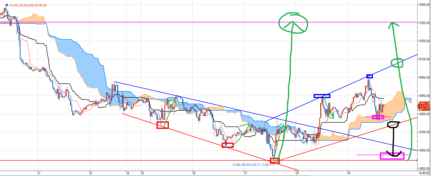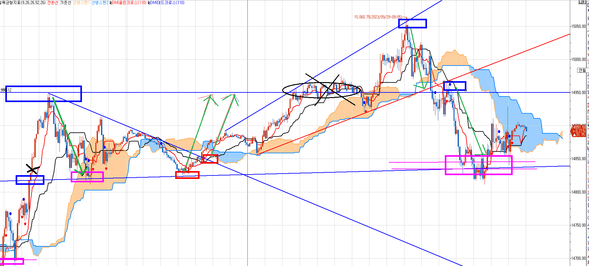 그러나 빨간사선(지지선)이 깨진다면 검정색(화살표) 표시한 것 처럼 다시 9월27일의 저점대인 14630~14600까지 빠질 것이다. 그러면 나는 땡큐하고 그곳에서 매수로 싸울 것이다. 쌍바닥 찍으러 한번 다시 내려와야 될것 같은데....... 쌍바닥 찍고 올라가야 진짜 매수 파동인데.... 아님말고~ 나스닥아 니 하고 싶은대로 해라~