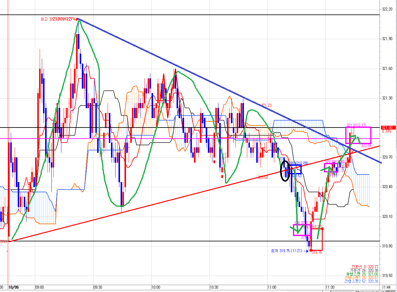 그리고 오늘 저점 부근인 319.90 까지만 먹으면 된다 (분홍색 박스) 더 매도 먹으려고 하면 반드시 체한다.