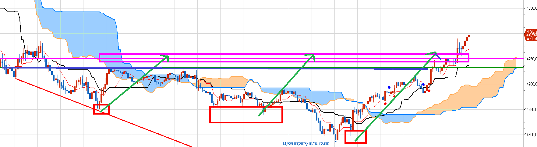 2차 매도 목표가 14700~14680 아래쪽 분홍박스 구간. 여긴 갈수도 있고 오늘 안갈수도 있고.
