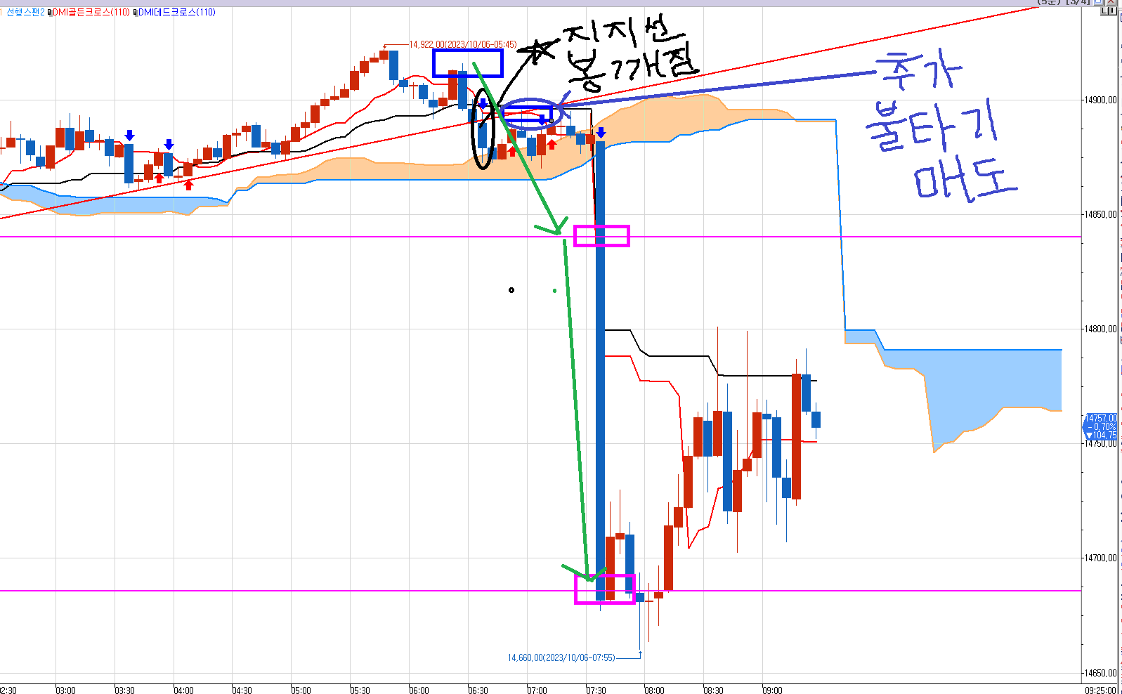 지지선이 깨졌으니 고작 위에서 1개 매도 잡은 것으로 만족 할수 없어 1개 더 불타기 들어간 것이다.