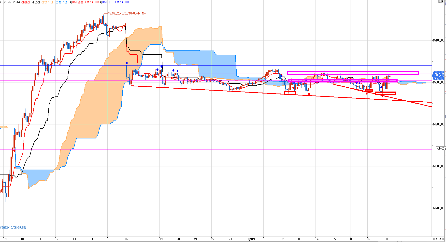 가장 위 파란색 저항선이 양봉으로 돌파되면.. 오늘 15350 찍으러 날라 갈 수도 있다.