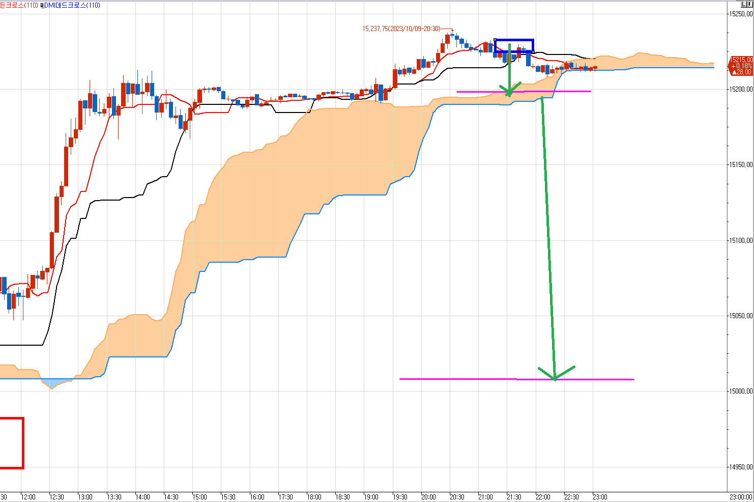 글쓰는 사이에 일목균형표 5분봉에서 양운이 깨지고 있다.