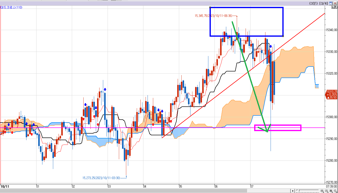 3분봉에 매도 목표가 발생했다. 100% 가는 목표가다.